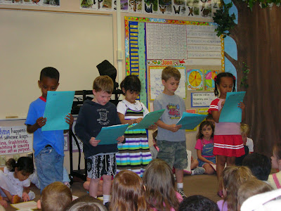 For the readers theater his group read the Gingerbread Boy. Ridge did a great job but I felt sad for him when the teacher announced to the little audience that they had been practicing an hour each day for 3 weeks. Ridge's reading skills are much more advanced, this was something that he could have read aloud in front of a group on the first try, and I felt bad that he had to be so bored. He was reluctant to have me come because he said his group didn't have good readers in it. They all did a great job, the practicing paid off. I think that he was also a little embarrassed about "performing" since he tends to be more shy in front of people. It has been a good year. And now I'm the parent of a 1st grader. Though we wonder if he should skip ahead...